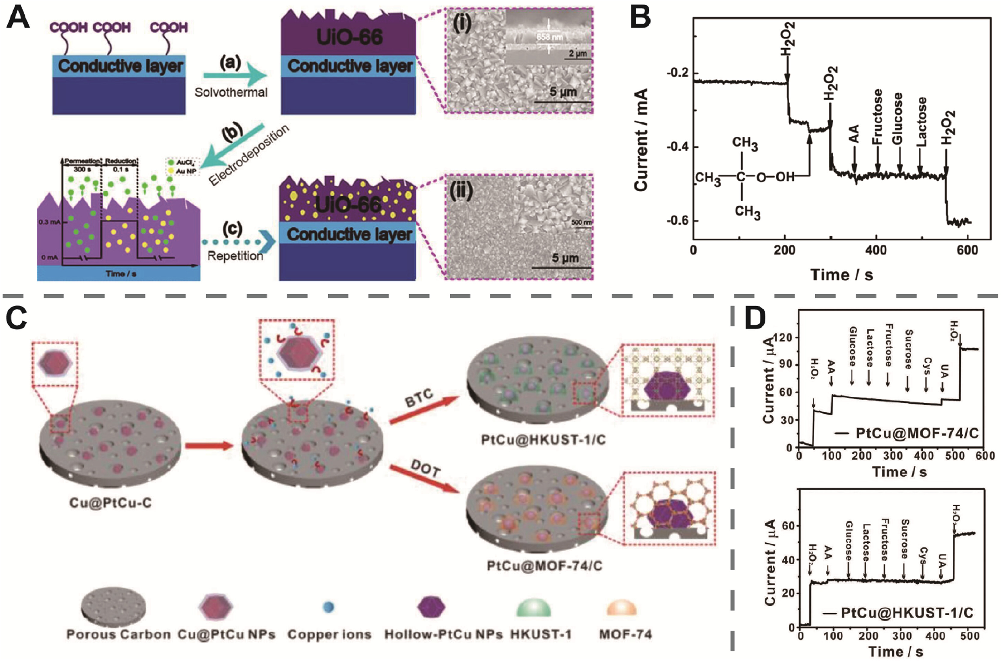 | Fig. 5. (A) Schematic illustration of the fabrication process of the Au NPs/UiO-66 film: (a) solvothermal, (b) electrodeposition, and (c) repetition. Insets show the top-view SEM images of the surface of the UiO-66 film (ⅰ) and Au NPs/UiO-66 film (ⅱ) and the cross-sectional SEM image of the UiO-66 film (inset of (ⅰ)). (B) Current response of the 50-Au NPs/UiO-66 film to 0.5 mmol/L H2O2 in the presence of 0.5 mmol/L TBHP, AA, fructose, glucose, and lactose is shown. (A, B) Reproduced with permission [119]. Copyright 2021, American Chemical Society. (C) Schematic illustration of the synthesis of PtCu@MOFs supported on PC. (D) Current response of PtCu@MOF-74/C (Top) and PtCu@HKUST-1/C (Bottom) to 50 × 10−6 mol/L H2O2, AA, glucose, α-lactose, d-fructose, sucrose, l-cysteine, and UA at +0.4 V (vs. SCE) in a 0.1 mol/L PBS solution (pH 7.4). (C, D) Reproduced with permission [120]. Copyright 2018, Wiley. | |