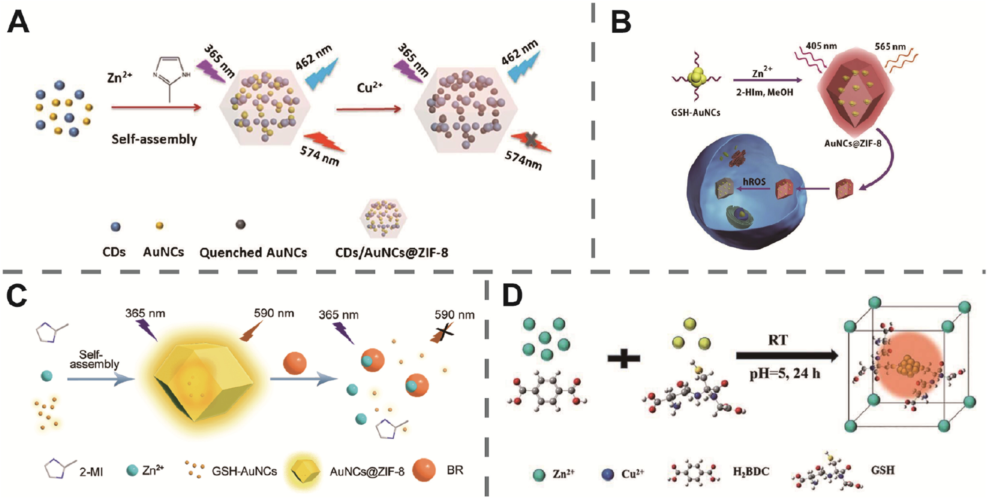 | Fig. 6. (A) Schematic illustration of the strategy for the detection of Cu2+. Reproduced with permission [127]. Copyright 2020, Springer. (B) Schematic illustration of synthesized AuNCs@NMOFs nanocomposites and hROS detection in living cells. Reproduced with permission [128]. Copyright 2019, Elsevier. (C) Schematic illustration of the sensing mechanism of bilirubin by AuNCs@ZIF-8. Reproduced with permission [129]. Copyright 2021, Royal Society of Chemistry. (D) Schematic illustration of the one-pot synthesis of CuNCs@GSH/MOF-5 composites. Reproduced with permission [131]. Copyright 2018, Royal Society of Chemistry. | |