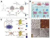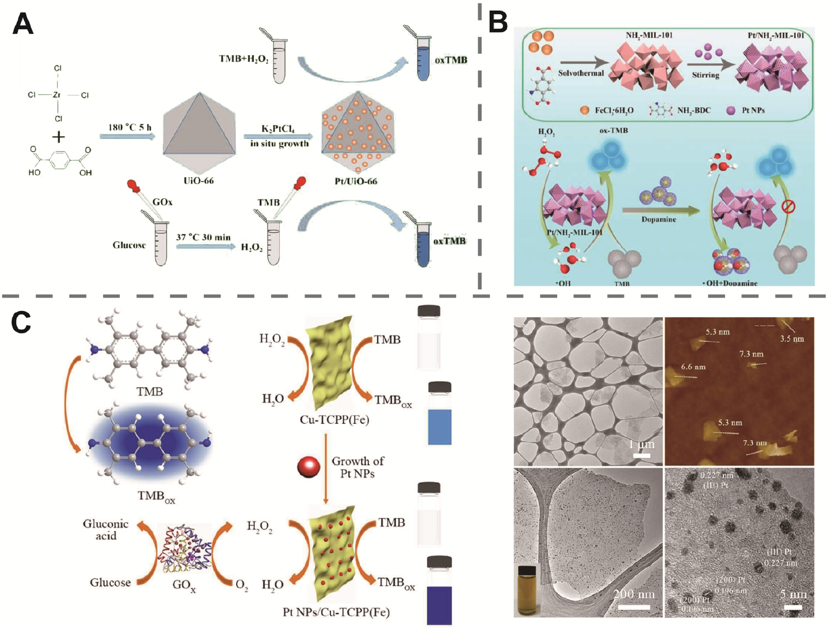 | Fig. 7. (A) Schematic illustration for the preparation of the Pt/UiO-66 hybrid nanozymes and detection of glucose. Reproduced with permission [139]. Copyright 2021, American Chemical Society. (B) Schematic illustration of the synthesis of Pt/NH2−MIL-101 and the detection of dopamine. Reproduced with permission [146]. Copyright 2021, MDPI. (C) Schematic illustration of the synthesis of Pt/Cu-TCPP(Fe) composites and their application in the colorimetric detection of H2O2 and glucose. Low-magnification TEM image of Cu-TCPP(Fe) nanosheets. AFM image of Cu-TCPP(Fe) nanosheets. TEM image of PtNPs/Cu-TCPP(Fe) hybrid nanosheets. Inset: Photograph of the PtNPs/Cu-TCPP(Fe) hybrid nanosheets solution. HRTEM image of PtNPs/Cu-TCPP(Fe) hybrid nanosheet. Reproduced with permission [150]. Copyright 2018, American Chemical Society. | |