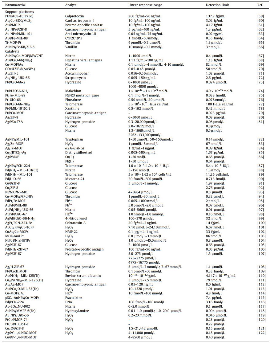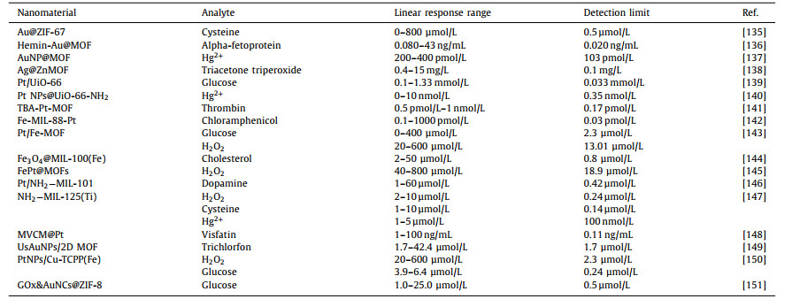 (2) Both precious metal nanoparticles and bimetallic nanoparticles consisting of precious metals and base metals, exhibit sensing performance with great promise through associating with MOFs. It is found that Au NPs and Ag NPs appear frequently in numerous reports. Nevertheless, it is quite realistic that there are concerns about rareness and expensiveness of noble metals. In MNPs/MOFs used for sensing, base metal NPs should be considered instead of noble metal NPs.
