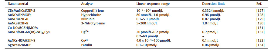 It is notable that some MNCs have distinctive luminous capabilities [123-125]. However, in fluorescence sensing applications, their limited environmental durability and weak quantum yield offer substantial hurdles [126]. By intergrating MNCs with porous MOFs, we can create MNCs/MOFs composites to overcome the above concerns since the increased durability and luminescent efficiency of MNCs.