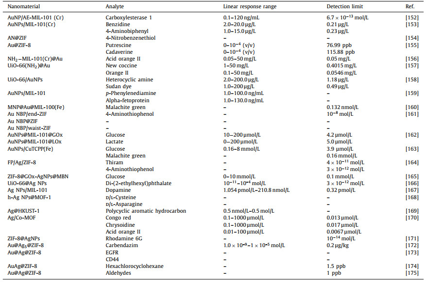 3. Conclusions and outlookOver the last decade, the number of sensors on the basis of MNPs/MOFs composites has increased sharply. Applications of MNPs/MOFs composites in different fields of sensing and their synergistic effects in improving the sensing exhibition are introduced. Then, according to the types of sensors based on MNPs/MOFs composites, they are divided into different sensors involving electrochemical sensing, fluorescent sensing, colorimetric sensing, SERS sensing and CL/ECL sensing, which are introduced emphatically. Particularly, the characteristics of MNPs and MOFs are reviewed, which have synergistic processes are commonly used to classify the mutual effects of MNPs and MOFs: (1) MNPs function as active centers while MOFs have a stabilizing effect on MNPs. (2) Easily aggregable MNPs are limited in MOFs to ensure signal certainty. (3) Owing to the high porosity of MOFs, it is possible to ensure the entry of suitable sized reactants, which then react with the MNPs as active centers. (4) Either MNPs or MOFs function as active sites for tandem catalysis.