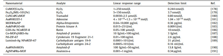 2.5. Chemiluminescence/electrochemiluminescence sensorsChemiluminescence (CL) is defined as the emission of electromagnetic radiation caused by a chemical reaction. It forms an intermediate product in an electronically excited state and emits light as it relaxes to the ground state [176,177], which can be concisely defined as the chemical reaction of luminescence, while electrochemiluminescence (ECL) is an electrogenerated chemiluminescence phenomenon which has been intensively explored in past decades. In accordance with previous findings, MNPs/MOFs composites can be used to manufacture CL/ECL sensors, and improves the intensity and improving efficiency of CL/ECL on account of its excellent catalytic performance (Table 5).