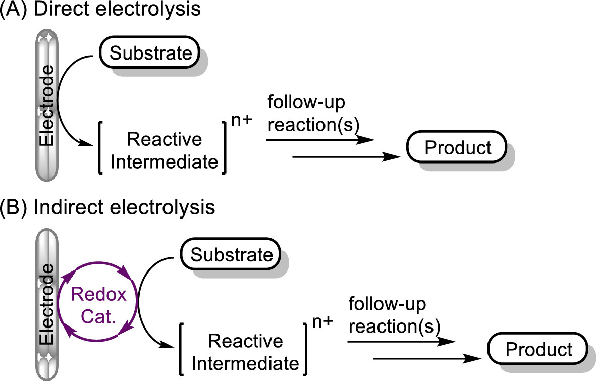With increasingly serious energy and environmental issues, reducing pollution at the beginning and developing sustainable chemistry has become particularly urgent. In this regard, organic electrosynthesis has been treated as a green and sustainable alternative to conventional synthetic chemistry. Notably, organic electrosynthesis uses electricity as a clean redox agent to replace the toxic and dangerous chemical redox reagents, realizing electrical-driven chemical reactions. And it is one of the research hotspots in current synthetic chemistry and possesses mild reaction conditions and high atom economy [1-10]. Moreover, chemoselectivity and reaction progress can be precisely controlled by adjusting applied potential, current, and electrode materials [2,11]. Generally speaking, the electrolysis model normally includes direct electrolysis and indirect electrolysis (Fig. 1). Direct electrolysis refers to the direct redox reaction of electroactive species on the surface of the electrode. It mainly depends on the redox potential of the substrate, and maybe suffer from the limited substrate range and difficult compatibility of sensitive groups. Indirect electrolysis provides an alternative strategy, in which an electrocatalyst was used to promote the redox reaction under a mild condition. Compared with direct electrolysis, indirect electrolysis can effectively avoid excessive oxidation/reduction of the substrate, and thus the selectivity of the product is controllable.