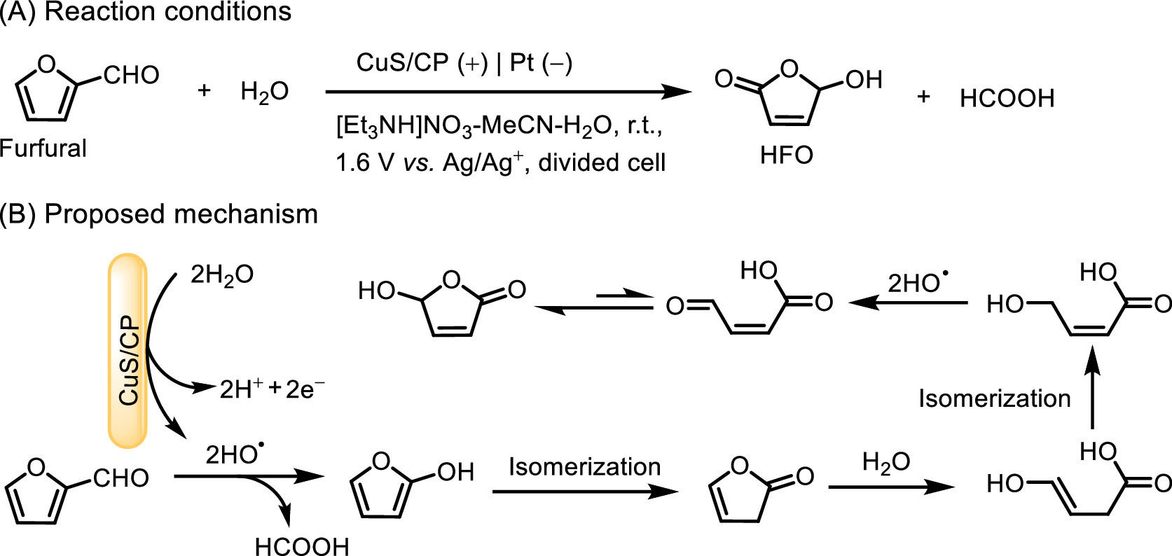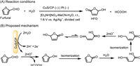 Apart from these, Wu et al. firstly described metal chalcogenides (MC) modified CP electrodes for the electrochemical oxidation of furfural to 5-hydroxy-2(5H)-furanone (HFO) using H2O as the oxygen source (Fig. 11) [80]. As a comparison, the as-prepared CuS/CP anode exhibited the best performance with 70.2% conversion of furfural and 83.6% selectivity of HFO than the other prepared MC/CP electrodes (i.e., ZnS/CP, CdS/CP, PbS/CP, WS2/CP and MoS2/CP). Furthermore, CuS/CP anode provided excellent long-term stability to maintain the FE and selectivity of HFO with 77.8% and 85.3%, respectively, within a reaction time of 24 h. Mechanism studies indicated that HFO was achieved by a multi-step reaction depicted in Fig. 11B, including the C-C bond cleavage of furfural, succeeding by ring-opening and oxidation, as well as intramolecular isomerization.