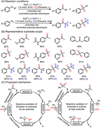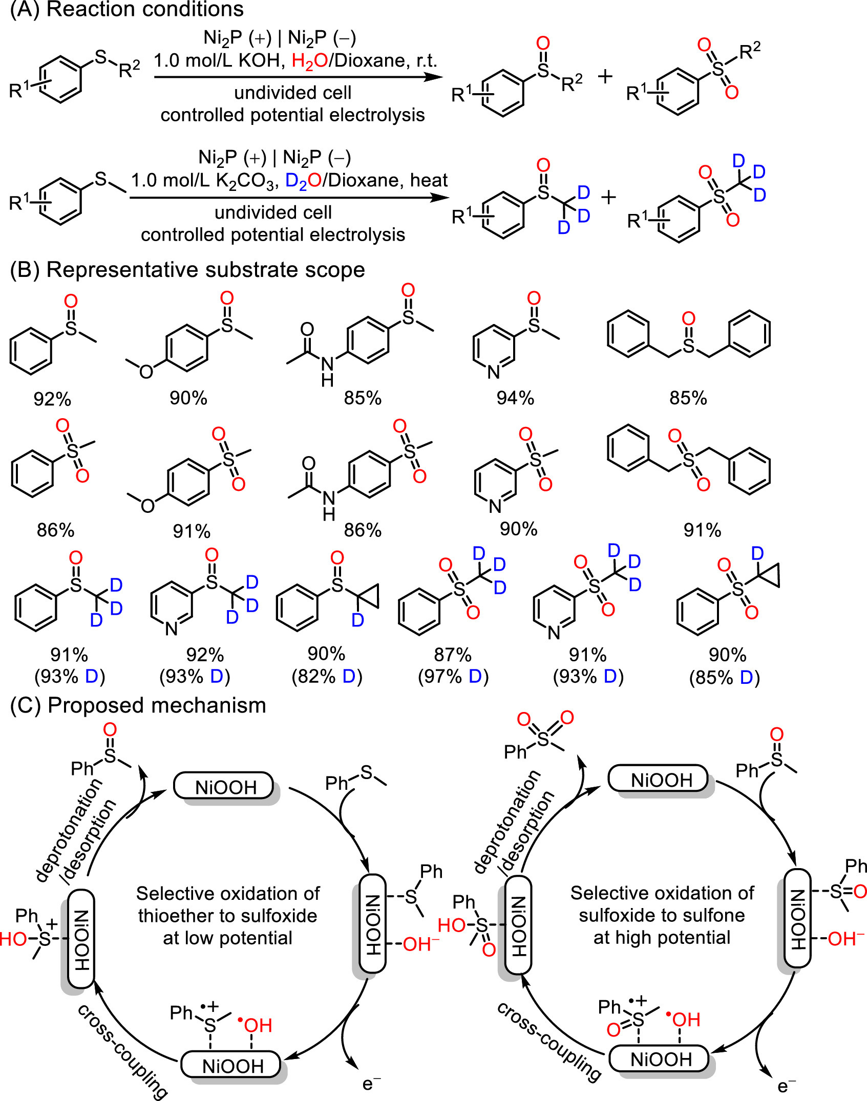 2.3. Electrocatalytic thioethers oxidationSulfoxide and sulfone skeletons are invaluable structural components in pharmaceuticals and functional materials [82,83]. Traditional procedure to construct this skeleton mainly relied on selective oxidation of thioether using homogeneous catalysts with O2 or H2O2 as the main oxygen sources [84,85]. Obviously, the cost, safety and product purification are the disadvantages. Recently, the electrooxidation of thioether has been developed. However, it suffers from limited noble metal electrodes, expensive electrolytes and O2 [86,87]. To solve this issue, Han et al. investigated nickel phosphide (Ni2P) hollow nanocubes modified NF electrode for membrane-free selective thioether electrooxidation with H2O as the oxygen source (Fig. 12) [88]. By adjusting the potential, the controllable synthesis of sulfoxides and sulfones could be achieved with high yields and selectivity. The surface in-situ reconstruction of Ni2P to NiOOH played a pivotal role in assisting the formation of NiII/NiIII redox couple. The reaction was initiated by the oxidation of thioethers which was adsorbed on the Ni site of NiOOH, generating the radical cation. And •OH was formed at the same time via water electrolysis, followed by the radical cross-coupling and deprotonation to accomplish the sulfoxides. Sulfones could be obtained at a higher oxidation potential through a similar process with sulfoxides as the substrates. As a comparison, bare NF, Pt and CFP anodes were inert in the low potential system, whereas Ni2P nanosheets and Ni2P nanoparticles modified anodes delivered low yields of sulfoxides. These results also demonstrated that high valance Ni species were the actual active centers, and the morphologies of Ni2P also affected catalytic performance. The excellent catalytic performance of Ni2P hollow nanocubes might be due to its higher surface area and exposure of more catalytic active sites than Ni2P nanosheets and Ni2P nanoparticles. In addition, the Ni2P hollow nanocubes modified anode could be recycled six times without a significant decrease in catalytic activity. And this method displayed broad functional group compatibility and easily synthesized deuterated sulfoxides and sulfones.