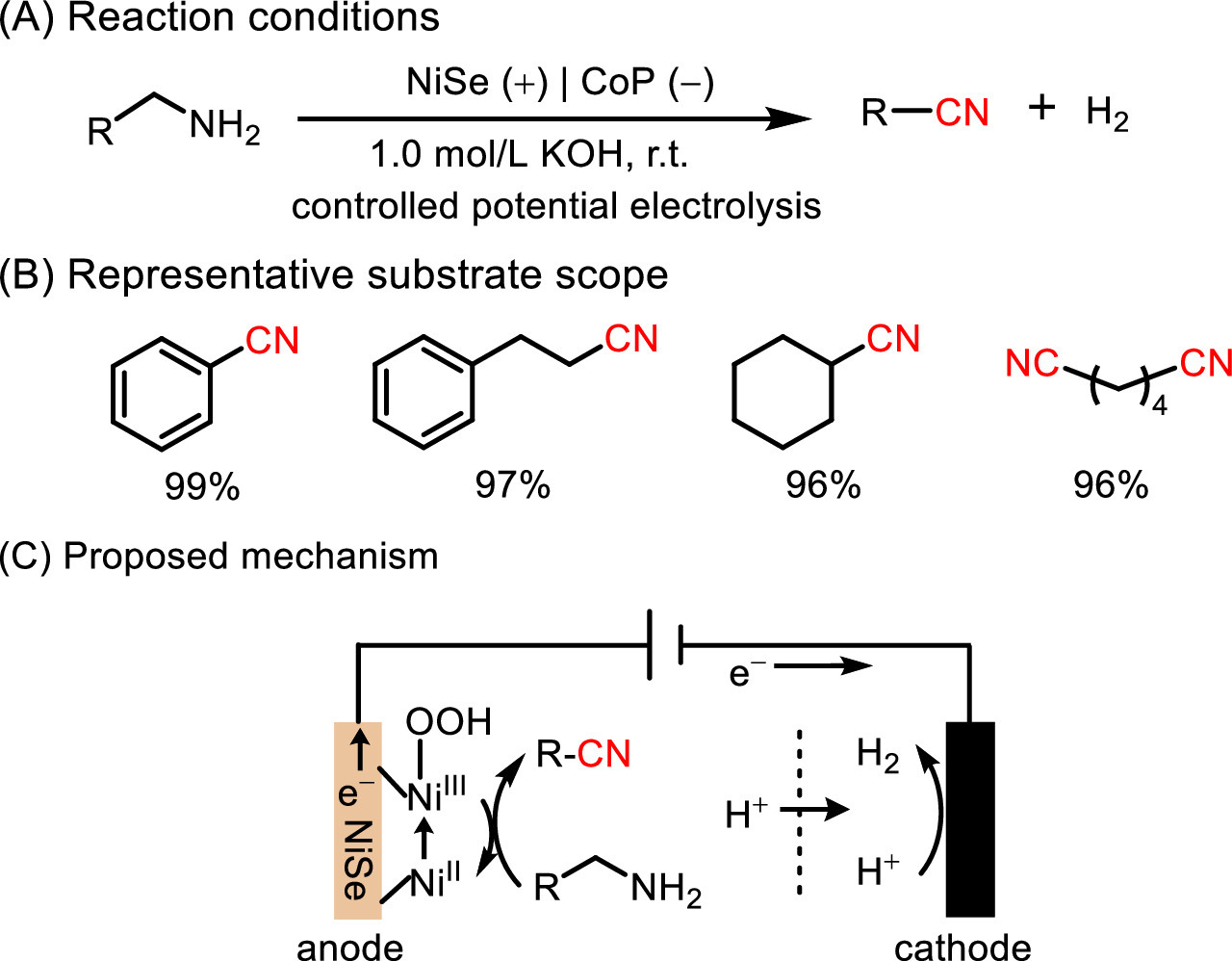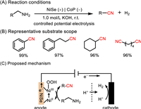 Nitriles are useful intermediates for the synthesis of pharmaceuticals, agrochemicals, and fine chemicals [89-91]. Selective oxidation of primary amines to nitriles could avoid the use of HCN or metal cyanides [92]. Unfortunately, most of the reported methods usually require high temperature and/or high O2 pressure with the presence of additives for oxidation [93-95]. Hence, replacing thermocatalysis with electrocatalysis might be an effective solution. Huang et al. developed a NiSe nanorod anode prepared by direct selenization of commercially NF to promote oxidant-free electrooxidation of primary amines to the corresponding nitriles at room temperature (Fig. 13) [96]. At the NiSe nanorod anode, the surface NiII was first oxidized to form NiIIIOOH in alkaline solution, which then oxidized primary amines into nitriles, along with conversing NiIIIOOH into NiII (Fig. 13C). A wide range of structurally diverse nitriles were prepared in excellent yields. The non-water-soluble feature of nitriles could easily escape from the aqueous electrolyte/electrode interface, avoiding catalyst deactivation. Moreover, NiSe nanorod anode remained highly active within six runs and favored the continuous gram-scale nitrile production with industrial practicability. Notably, replacing sluggish oxygen evolution reaction with electrooxidation of thermodynamically more favorable primary amines in water splitting system, the cell voltage was significantly reduced relative to that of overall water splitting. Similarly, Mondal et al. declared a crystalline intermetallic nickel silicide catalyst (Ni2Si NPs) prepared by a simple one-pot colloidal approach, aiming to produce high-value oxidation and reduction products (nitriles and H2, respectively) [97]. The active phase NiIIIOxHy was formed by accompanying the corrosion of Si to silicate under alkaline condition. The Dissolution of Si might result in more porous NiIIIOxHy phase with a distorted layered structure and facilitate electrolyte penetration. Furthermore, the activated form of Ni2Si exhibited highly efficient electrocatalytic oxidative dehydrogenation of primary amines with high selectivity and a wide range of substrates.