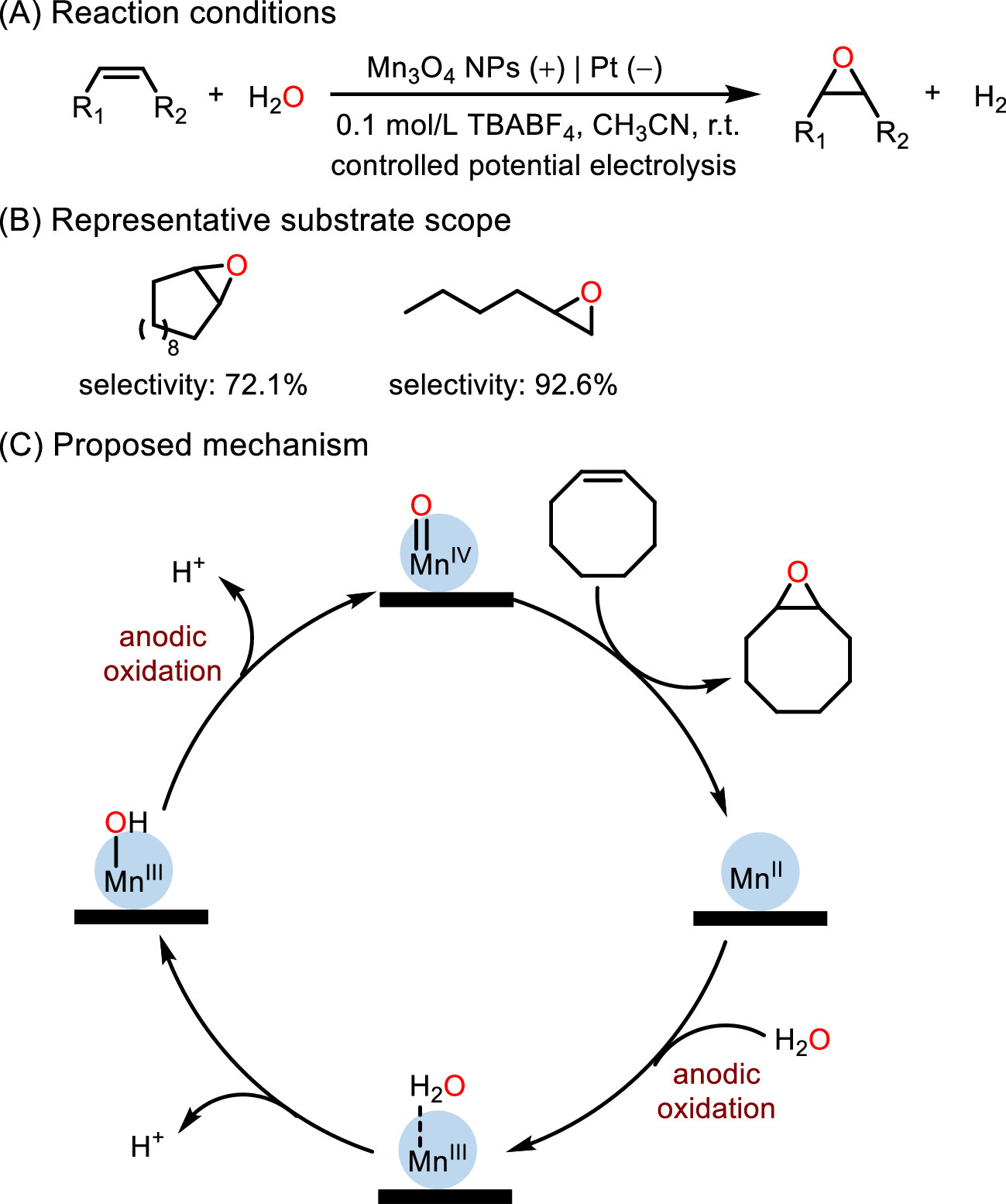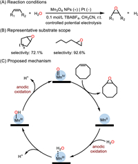 In order to facilitate the separation of catalyst from the reaction system and avoid the use of additional reagents, Jin et al. demonstrated a sustainable and green route to epoxidation reactions. They used Mn3O4 nanoparticles modified carbon paper as the anode and H2O as safe oxygen atom source (Fig. 15) [102]. The experiment results indicated MnIV-oxo species played a pivotal role in this electrochemical oxidation and isotopic studies revealed H2O as the sole oxygen atom source. In addition, the modified electrodes exhibited efficient catalytic epoxidation of cyclooctene with FE above 30% at the anode and coproduction of H2 with FE above 94% at the cathode. Unfortunately, the FE and yields of electrocatalytic olefins oxidation are not high enough, and much work need to be further explored.
