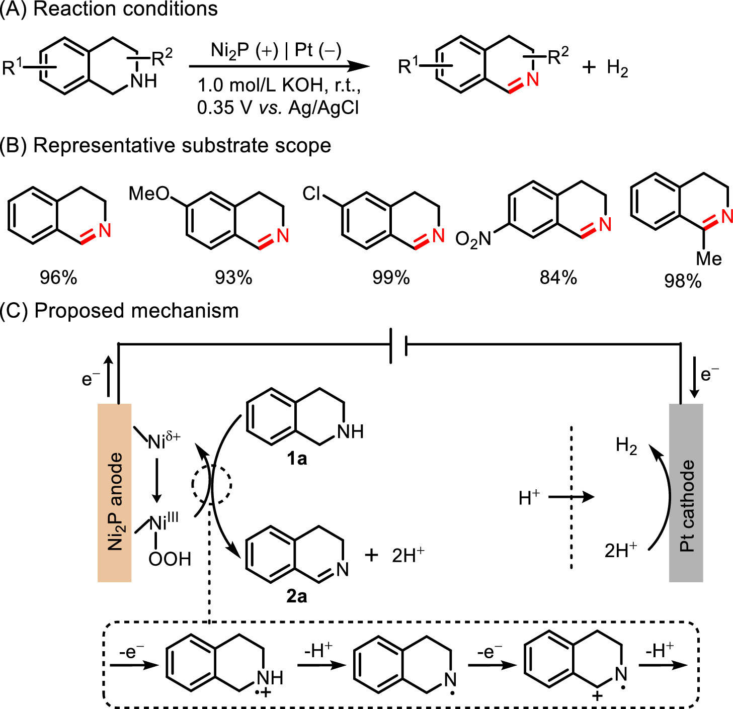 | Fig. 16. Ni2P modified electrode for electrochemical semi-dehydrogenation of tetrahydroisoquinolines. | |