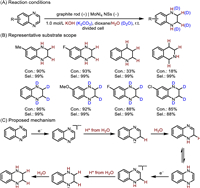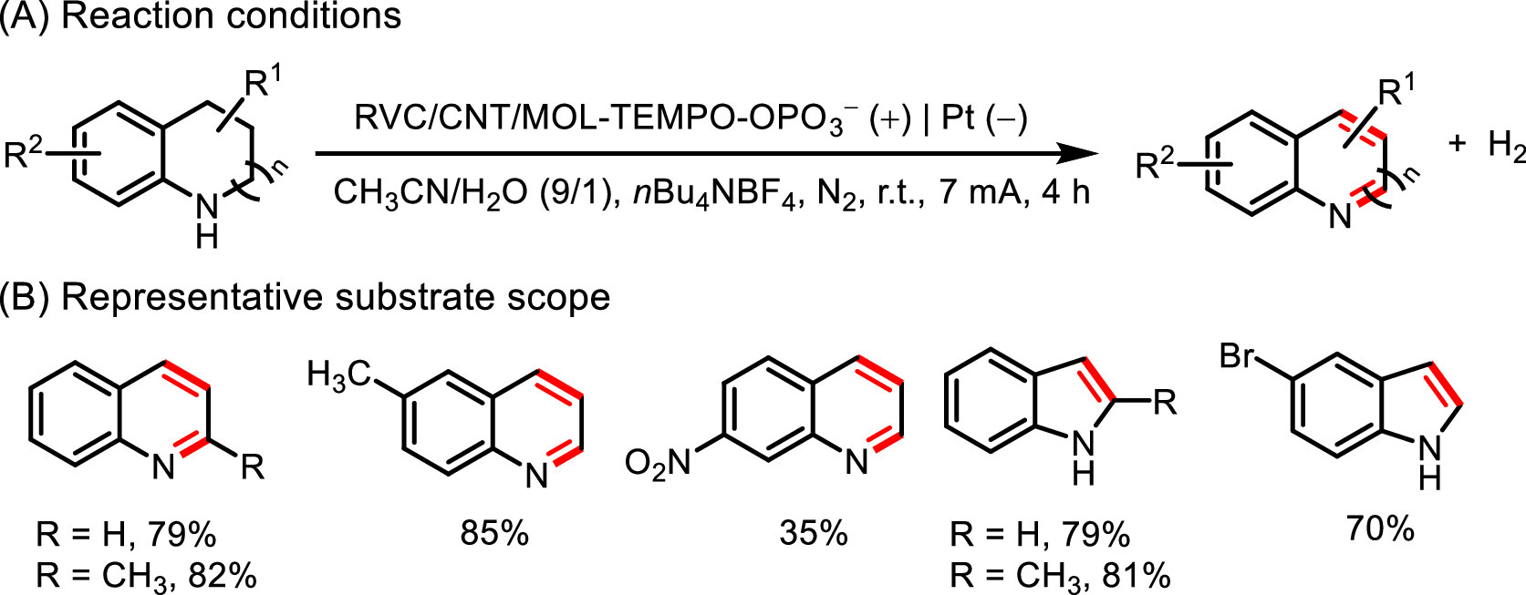 The catalytic acceptorless dehydrogenation of N-heterocycles is a dominant strategy to access quinoline and indole rings, which are frequently encountered in pharmaceuticals and bioactive molecules. Traditional dehydrogenation needs oxidants or sacrificial hydrogen acceptors, which often generate undesirable byproducts such as toxic metal salts [103,104]. At present, electrochemistry has offered an efficient way to achieve acceptorless dehydrogenation with H2 production. In addition, replacing homogeneous catalysts with heterogeneous catalysts could avoid the tedious separation step and the contamination of the products. In 2019, Huang et al. explored the use of a Ni2P bifunctional electrode to promote selective semi-dehydrogenation of tetrahydroisoquinolines (THIQs) (Fig. 16) [105]. Preparation of the modified electrode by immersing the nickel foam into Ni(NO3)2⋅6H2O aqueous solution, followed by annealing and phosphidation. The Ni2P nanosheet electrode exhibited high activity at controllable electrooxidation from THIQs to dihydroisoquinolines (DHIQs), as well as the production of H2 at the same time. At the anode, NiIII-OOH was first formed and then it oxidized 1a to 2a. A wide range of structurally diverse DHIQs were obtained in good yields and excellent selectivity. Remarkably, the Ni2P electrode could be recycled up to 6 times without significant loss in electrocatalytic activity and maintained the nanosheet arrays morphology. Then, Li et al. prepared a Ni-Mo catalyst as both the cathode and anode to achieve hydrogenation and dehydrogenation of N-heterocycles using water as the H source [106]. Mo atom with superior hydrogen adsorption property could accelerate the generation of active H* species, promoting hydrogenation of the quinoxaline. And Ni component could be electrooxidized to NiOOH leading to the formation of NiII/NiIII redox couple, which facilitated the oxidative dehydrogenation of hydrogenated quinoxaline. Subsequently, Wang et al. reported Co3O4@NiO bifunctional electrodes could enable electrocatalytic semi-dehydrogenation of THIQs and simultaneous electroreduction of nitrate [107]. The modified electrode was prepared by coating Co3O4@NiO HNTs on CP electrode, in which Co3O4@NiO HNTs were prepared by using adopting Co-aspartic acid nanowires (Co-Asp NWs) as precursors via the cation-exchange reaction with Ni2+ and followed by annealing. The supported Co3O4@NiO HNTs catalyst displayed excellent activity and selectivity for both anodic THIQs semi-dehydrogenation to DHIQs and cathode nitrate electroreduction to ammonia. And NiIII-OOH and NO were the key intermediates for both reactions, respectively. In addition, Yang et al. reported the CNT/MOL-TEMPO-OPO32– electrode could promote dehydrogenation of N-heterocycles (Fig. 17) [108]. A range of quinoline or indole derivatives were obtained in moderate to good yields and the hybrid catalyst could be reused three times without loss of activity.