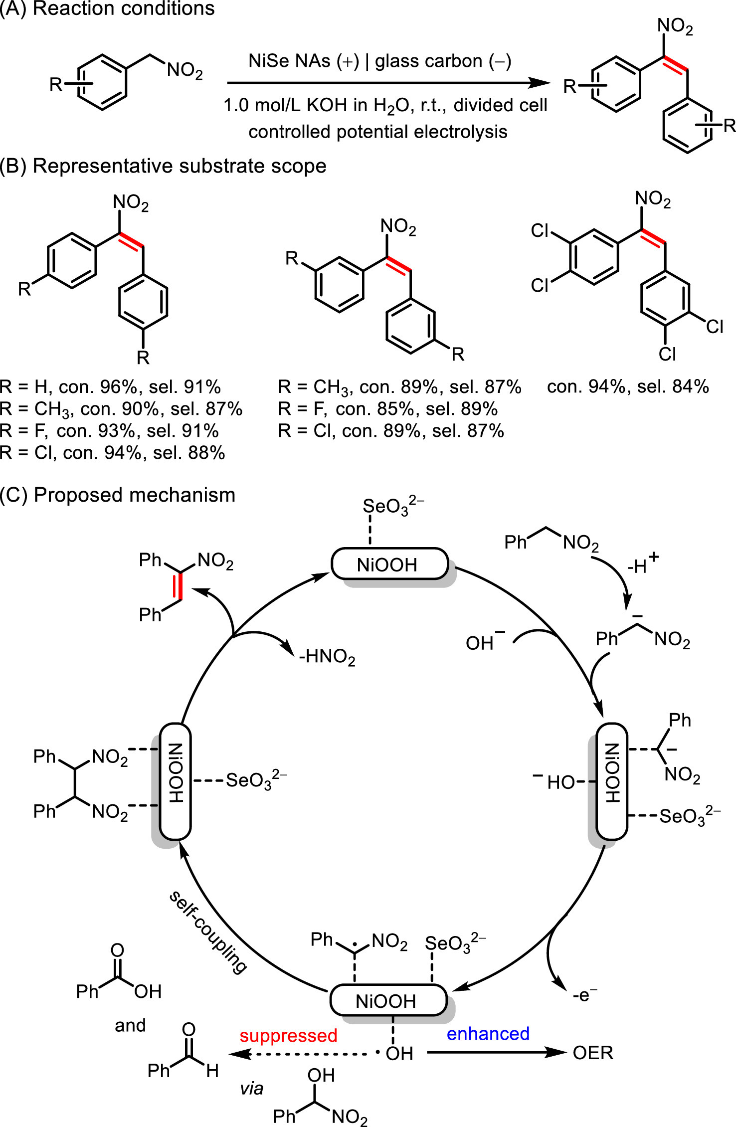 Recently, in another work by the Zhang's group, NiSe nanorod arrays (NAs) in-situ grown on NF electrode was employed to promote the electrooxidation of α-nitrotoluene to E-nitroethene (Fig. 19) [115]. The in-situ formed NiOOH surface layer, surface adsorbed SeOx2− through Se leaching-oxidation during electrooxidation, as well as the preferential adsorption of intermediate with two –NO2 groups on NiOOH played a crucial role for NiSe NAs anode to highly efficient electrooxidize α-nitrotoluene to E-nitroethene with 99% selectivity, 89% FE, and the reaction rate of 0.25 mmol cm−2 h−1. A plausible mechanism was proposed as well (Fig. 19C). The α-carbon radical was generated by the oxidation of α-carbon anion at the anode, followed by self-coupling to form the intermediate with two -NO2 groups, and then a HNO2 molecule was eliminated to obtain the desired products. This protocol displayed broad functional group compatibility and various E-nitroalkenes were obtained with good to high selectivity and high yields. Furthermore, the reaction could also be easily achieved at the gram scale with high selectivity and conversion yield.