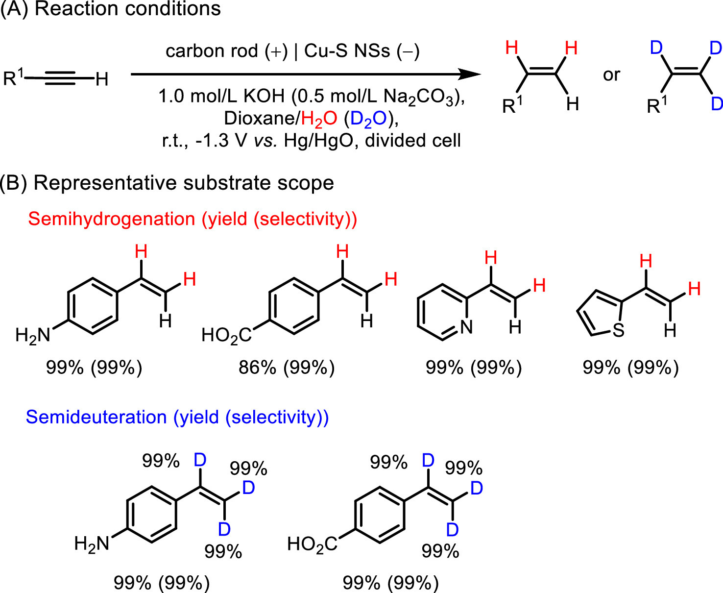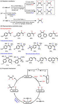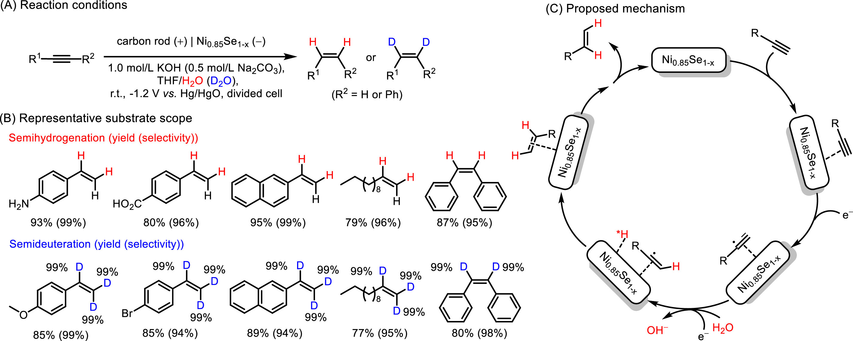 To sum up, Pd-P, Cu-S and Ni0.85Se1-x modified cathodes enable the efficient construction of alkenes from alkynes under mild conditions and H2O as the H source. The doping of P, S, and Se could tune the adsorption and desorption of reactants or intermediates with the electrode surface, which will affect the thermodynamics and kinetics of subsequent reaction, and further affect the reaction selectivity. On the other hand, the incorporation of heteroatom might regular the redox capacity of reductants, which will further control the reactivity and selection. In addition, their studies demonstrated that water electrolysis is the rate-determining step, hence, developing more active heterogeneous catalysts to speed up the kinetics of water electrolysis could substantially improve the semi-hydrogenation of alkynes.