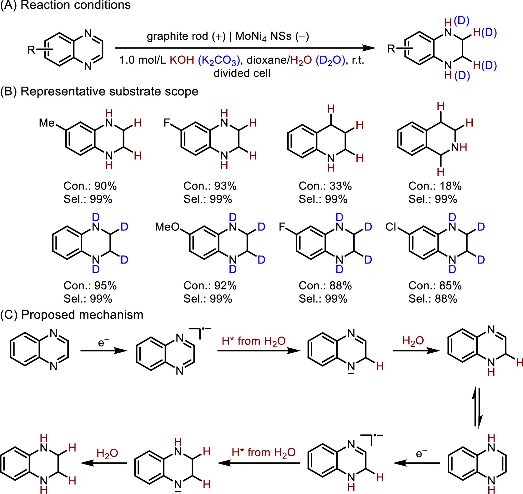 3.2. Electrocatalytic hydrogenation of N-heterocyclesThe catalytic hydrogenation of N-heteroarenes is of great importance in chemical synthesis, material science, and hydrogen storage transfer. However, it still faces the challenges of breaking the aromaticity of substrates and catalyst poisoning. To date, a number of homogeneous systems based on metal (e.g., Ru, Ir, Pd, and Rh) complexes are active for this kind of transformation [120,121]. Nevertheless, most of them suffer from limited expensive ligands, lack of recyclability, and flammable and explosive H2 or other expensive/toxic hydrogen sources, hindering their large-scale application. Thus, development of low-cost, safe hydrogen sources, and easily recovered and reused catalysts is urgently demanded. Recently, Li et al. exploited 3D self-supported MoNi4 porous nanosheets on NF electrode to achieve electrocatalytic water-involving transfer hydrogenation of N-heterocycles (Fig. 23) [122]. A 99% selectivity of 1, 2, 3, 4-tetrahydroquinoxaline and 90% FE were obtained. Electron paramagnetic resonance (EPR) experiment confirmed that the in-situ generation of H* from water electrolysis was the key intermediate for quinoxaline hydrogenation via radical coupling with the quinoxaline radical anion, and the plausible mechanism was depicted in Fig. 23C. In addition, a variety of N-heterocycles hydrogenated products were achieved in moderate to good yields, and easily obtained deuterated products with the deuterium ratios up to 99% by using D2O as the deuterated donor. Notably, MoNi4 could be used as a bifunctional electrode for electrocatalytic dehydrogenation of N‐heterocycles, and in situ Raman tests revealed that the NiIIIOOH formed on the surface of MoNi4 could promote the dehydrogenation process.
