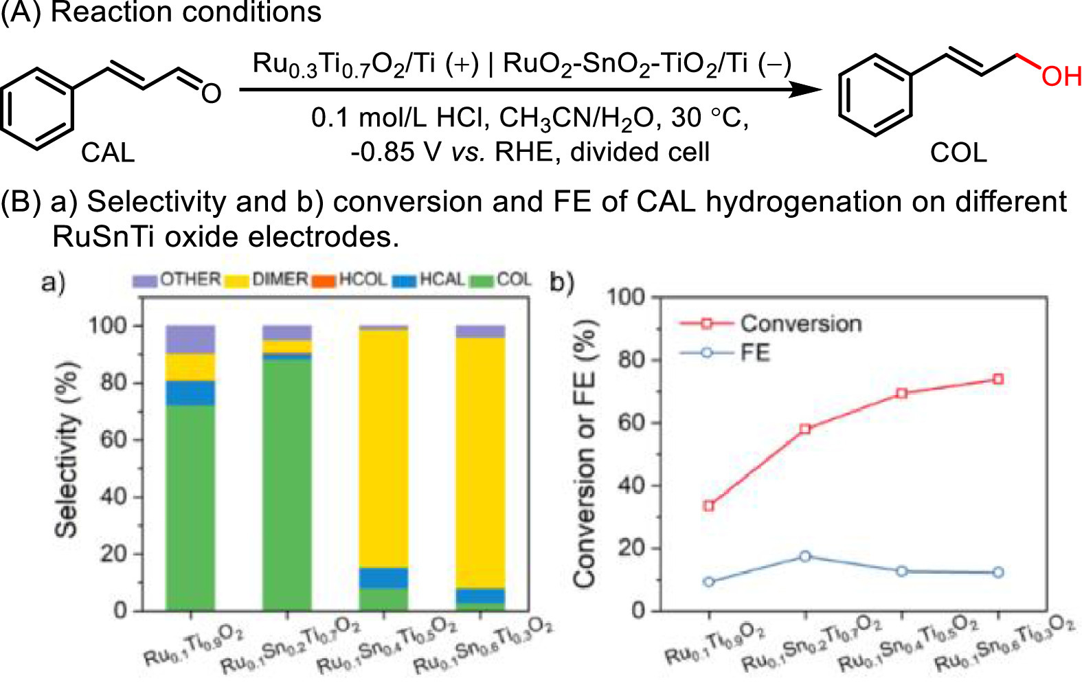 The selective hydrogenation of carbonyl compounds, especially α, β-unsaturated aldehydes/ketones, is of great significance in industrial production of fine chemicals. Traditional hydrogenation focuses on H2 as the H source and requires noble metal-based catalysts, which suffer from high cost and safety risk. Hence, it is highly desirable to develop a facile room-temperature hydrogenation method, especially with an inexpensive and safe hydrogen donor. Huang et al. employed the RuO2−SnO2−TiO2/Ti as the cathode to achieve highly selective conversion of cinnamaldehyde (CAL) to cinnamyl alcohol (COL) in acidic media (Fig. 24) [123]. The as-prepared Ru0.1Sn0.2Ti0.7O2/Ti cathode exhibited the highest COL selectivity with the value of 88.86% at 58.00% conversion of CAL among the reported pure metal and other RuxSnyTi1−x−yO2/Ti electrodes. The experimental and DFT calculation results indicated RuO2 was the active site, which preferentially interacted with C=O of CAL and decreased the reaction barrier toward COL formation. The doping of SnO2 could efficiently improve the FE, whereas high SnO2 content would lead to dimers as the main product. Furthermore, low pH value and high overpotential were also facile to enhance the COL selectivity and inhibit the dimerization product.