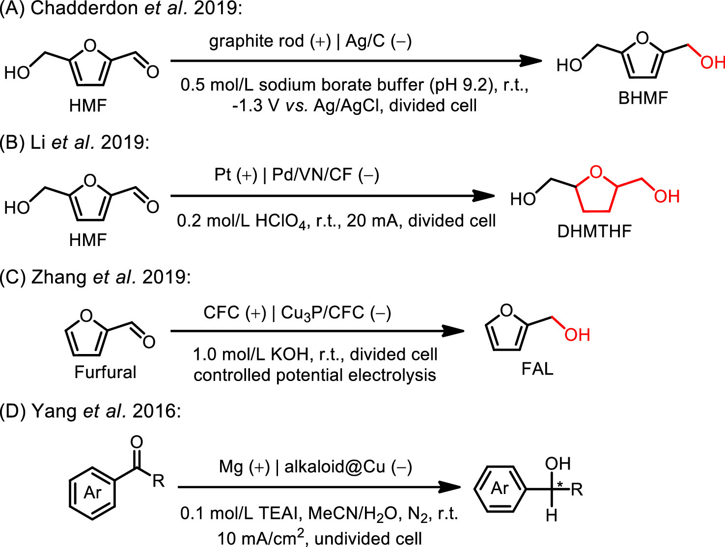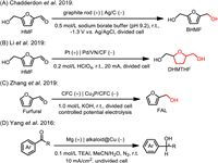 | Fig. 26. (A) Ag/C and (B) Pd/VN modified electrodes for electrocatalytic hydrogenation of HMF, (C) Cu3P/CFC electrode for electrocatalytic hydrogenation of furfural, (D) alkaloid@Cu cathode for electrocatalytic asymmetric hydrogenation of aromatic ketones. | |