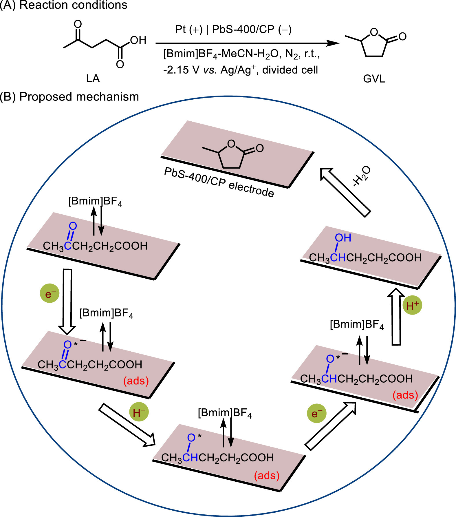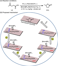 In another case, Wu et al. reported PbS-based materials modified CP electrode for electrochemical reduction of levulinic acid (LA) to γ-valerolactone (GVL) (Fig. 27) [127]. Interestingly, the degree of PbS surface oxidation to PbSO4 significantly affected the catalytic performance, which could be tuned by the calcination temperature. When the PbS was calcined at 400 ℃, the prepared PbS-400/CP electrode exhibited the best catalytic performance at a ternary electrolyte consisting of ionic liquids, H2O and MeCN (FE of 78.6% and current density of 13.5 mA/cm2) of the electrocatalyst materials reported to date. Moreover, it also showed high selectivity with GVL being the only product. Mechanism studies indicated that LA was transformed into GVL via electrochemical hydrogenation followed by subsequent intramolecular esterification.