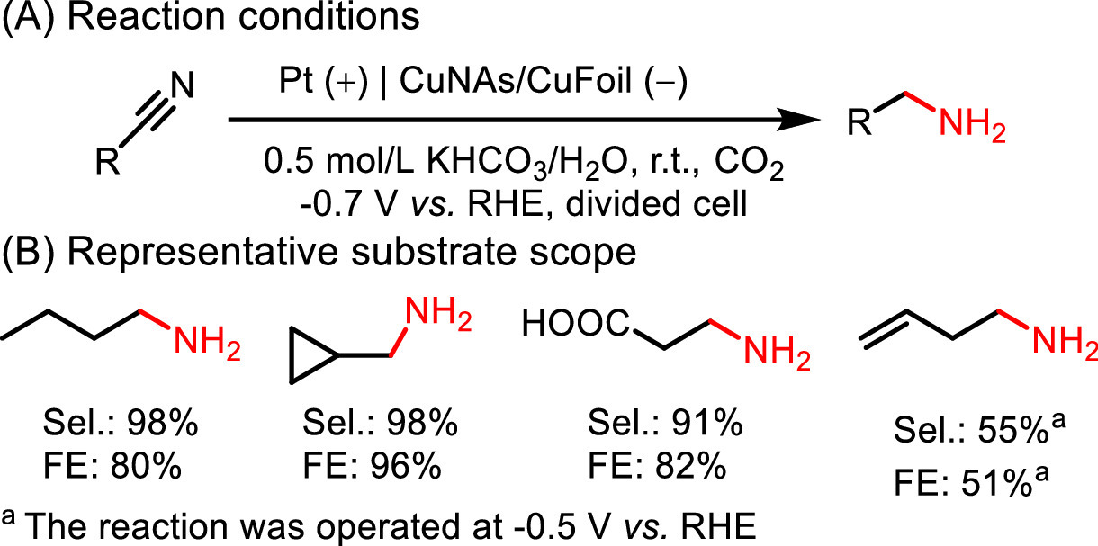 | Fig. 28. CuNAs/CuFoil for electrochemical reduction of nitriles. | |