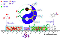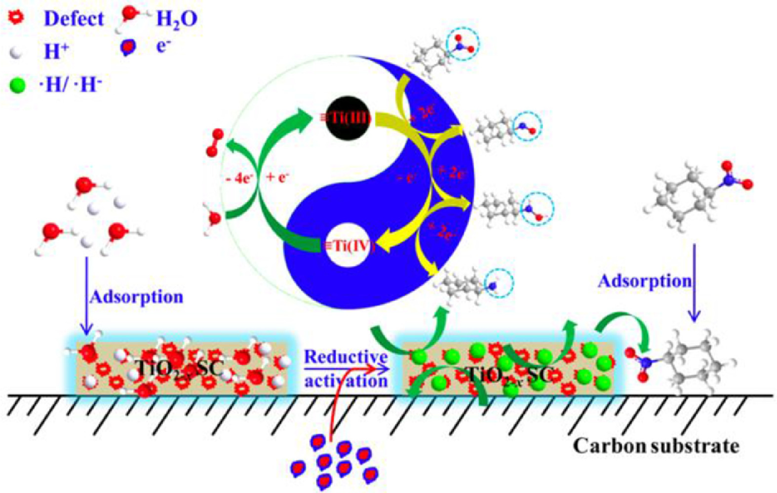 | Fig. 30. Defect-centered nitrobenzene reduction mechanism on the defective TiO2−x SCs. (The mixed-valence Ti species cycling between +3 and +4 states at oxygen vacancy sites provide as an efficient electron shuttle and transport route for reductive electrons migrated from carbon cathode to TiO2−x SCs and then to protons to generate active hydrogen (•H/•H−). Copied with permission [145]. Copyright 2016, American Chemical Society. | |
