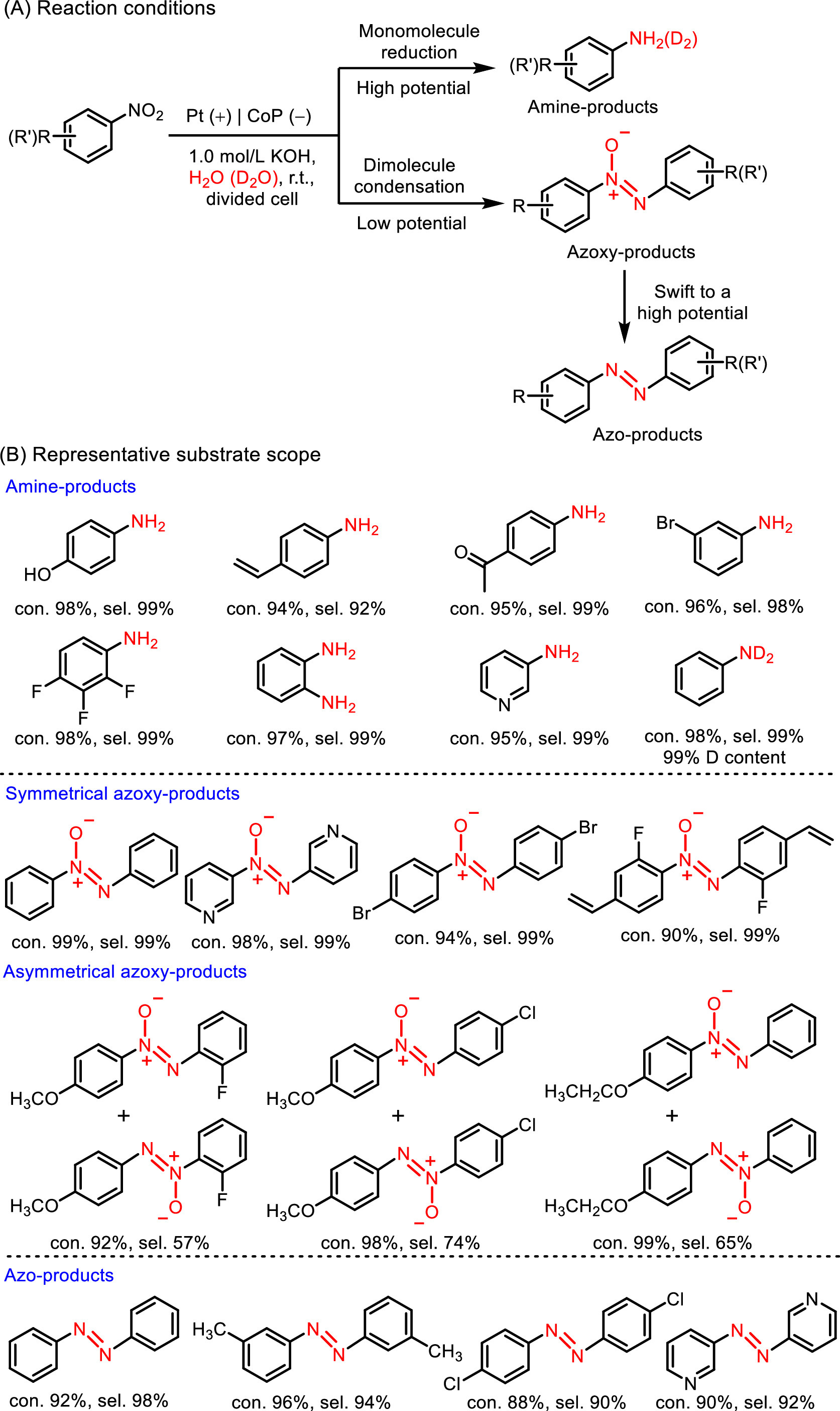 "Paired electrolysis", integrating anodic oxidation reaction with cathodic reduction reaction, enables maximum energy efficiency and the generation of value-added products. To date, the approach of paired electrolysis is mainly focus on the anodic organic oxidation reaction coupled with cathodic hydrogen evolution reaction. Recently, some new paired electrolysis reactions have been reported [115,116,147,151,165]. For example, in a Cu NWAs||Ni2P nanosheets two-electrode system, benzen-4-d-amine and high-value chemicals such as nitrile, aldehyde, and dihydroquinoline were successfully achieved at the cathode and anode, respectively [151]. In a NiSe||NiSe two-electrode electrolyzer, α-nitrotoluenes and N-protected aminoarenes could be simultaneously synthesized with good selectivity and conversion yields [115]. In a CoP||Ni2P two-electrode configuration, azoxybenzene and octylnitrile could be simultaneously gram-scale produced with high efficiency at the cathode and anode, respectively [147]. In the Pd-P||NiSe two-electrode system, 4-vinylaniline and adiponitrile were simultaneously obtained with high yields at the cathode and anode, respectively [116]. Despite recent advances, paired electrolysis is still very young in the organic electrosynthesis. Balancing the rates of cathodic and anodic reactions is crucial to the reaction efficiency in paired electrolysis. Hence, developing novel electrocatalysts to increase the reaction efficiency and selectivity indicate a new research trend. In addition, the relevant studies still stay in the laboratory stage, developing scalable production method for industrial settings is also urgent.