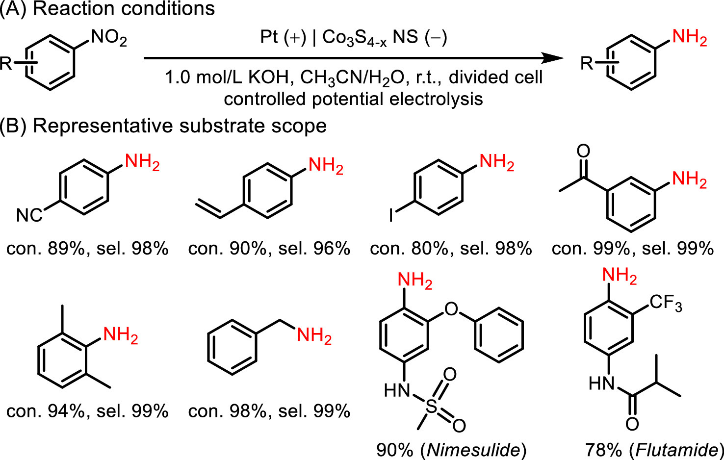 Selective catalytic hydrogenation of nitroarenes is of great significance for pharmaceuticals, pesticides, and dyestuff in chemical industry [131-136]. As early as 2001, Yuan et al. explored Pt/C modified cathode for electrochemical reduction of nitrobenzene [137]. As a result, 57.3% selectivity of cyclohexylanine and 28.2% selectivity of aniline with 8.2% conversion of nitrobenzene were obtained at 70 ℃ for 2 h. The limitation of the proton transportation as well as the low catalytic activity of the cathodic materials was probably responsible for the lower conversion of nitrobenzene. Hence, developing novel cathodic materials with high conductivity and electrocatalytic activity for the hydrogenation of nitroarene is necessary.