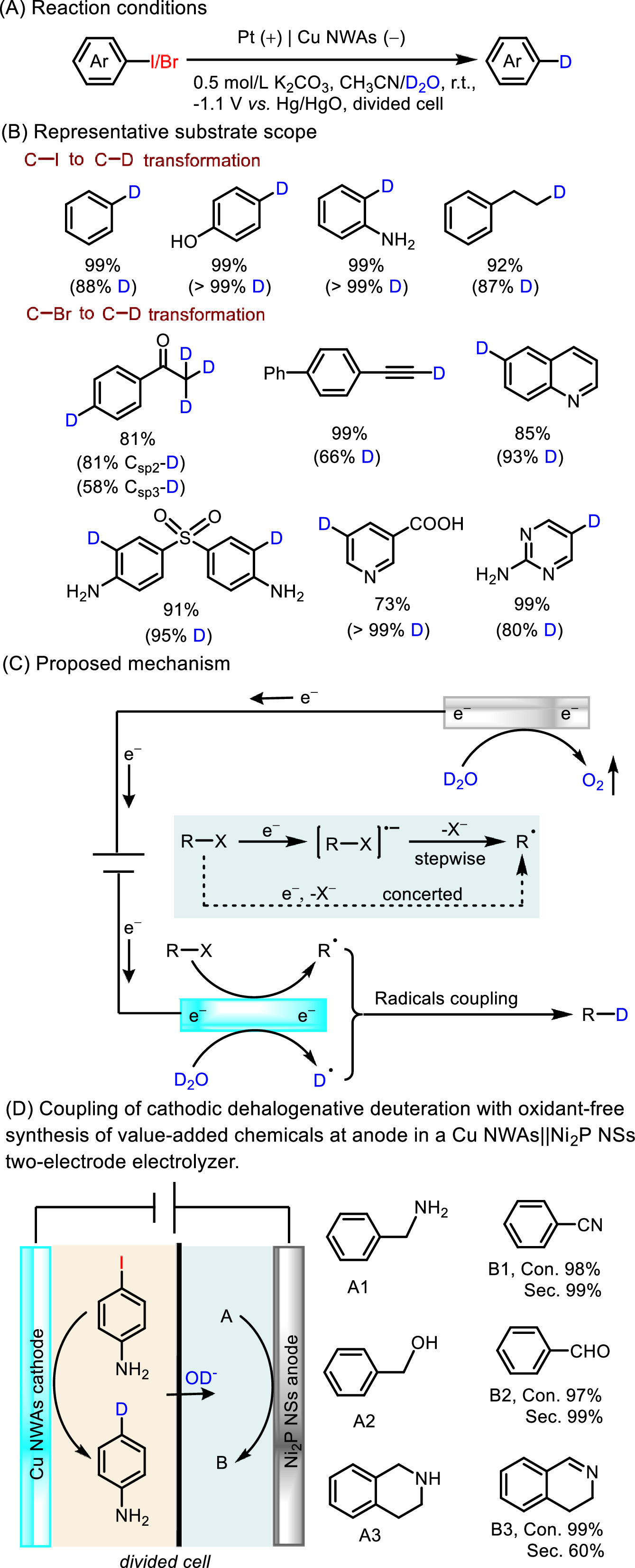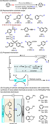 Recently, Zhang et al. proposed a facile electrocatalytic deuterodehalogenation of halides using a self-supported Cu NWAs on Cu foil as the cathode which was fabricated by in-situ electrochemical reduction of CuO NWAs (Fig. 33) [151]. The reaction was initiated by the Cu NWAs cathode reduction of halides producing the carbon radical via releasing a halogen anion, and the deuterium radicals were simultaneously generated by electrocatalytic D2O splitting. Then the desired products were formed by radicals cross-coupled reaction. This method possesses the advantages of environmental friendliness, good yields, broad substrate scopes and functional group tolerance. In addition, this electrocatalytic strategy could enable the transformation from C–H to C–D with high yields and deuterium contents via a one-pot halogenation-deuterodehalogenation process. Notably, in a Cu NWAs||Ni2P nanosheets (NSs) two-electrode system, benzen-4-d-amine and high-value chemicals such as nitrile, aldehyde, and dihydroquinoline were successfully achieved with excellent yields at the cathode and anode, respectively.