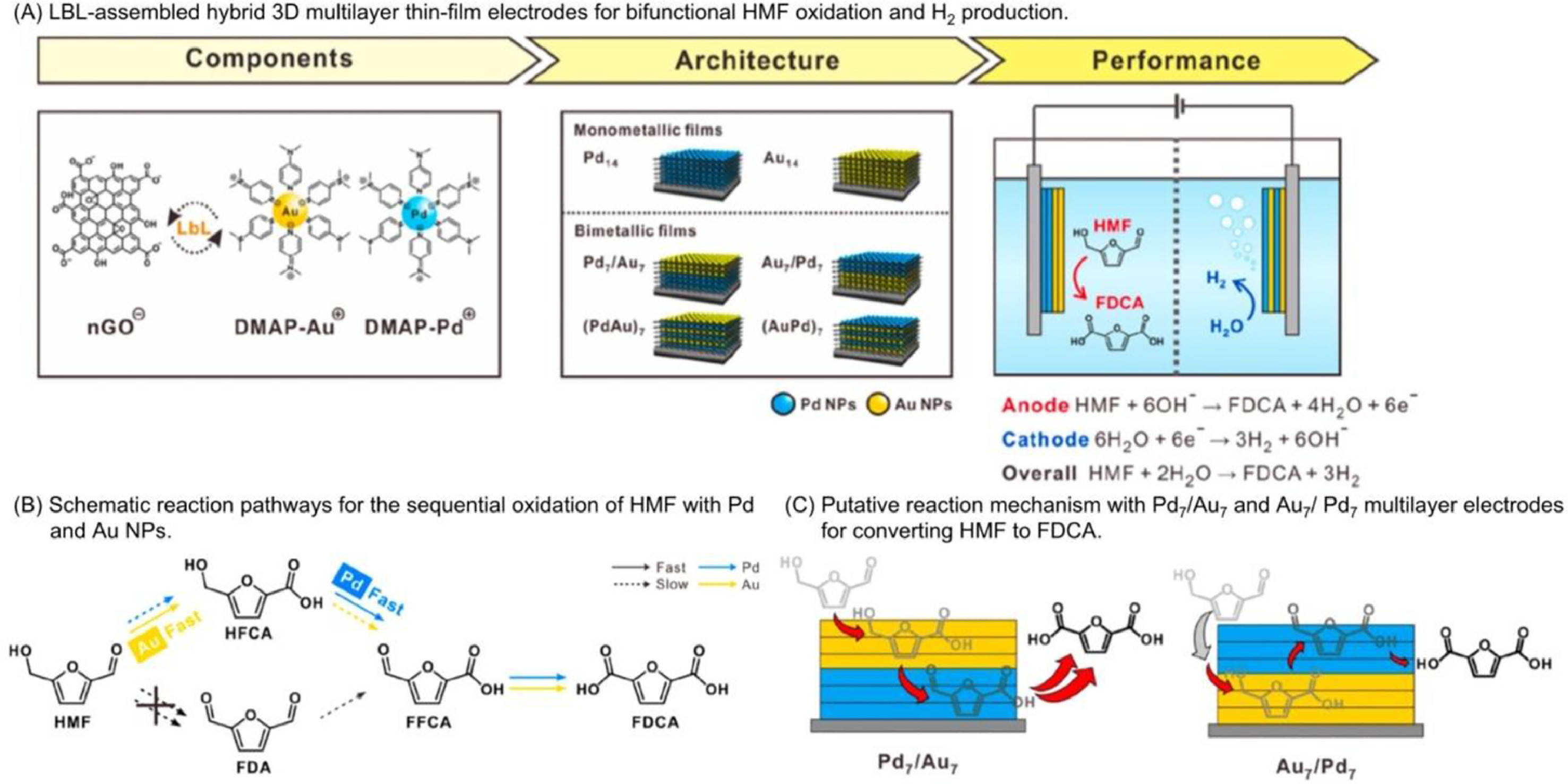 Park et al. proposed tailorable 3D hybrid multilayer electrodes for electrochemical oxidation of HMF (Fig. 5) [29]. The modified electrodes were prepared by Au, Pd, or their alloy NPs with nanosized graphene oxide (nGO) through layer-by-layer (LbL) assembly onto indium tinoxide (ITO) substrates. This approach takes advantage of precise regulation of the internal architecture of the LbL-assembled multilayer (including the thickness and position of Au and Pd NPs) to study the relationship between the nanoarchitecture of the modified electrodes and electrocatalytic activity. Interestingly, even the composition of NPs is the same, the Pd7/Au7 electrode with Au NPs located at the outer layer exhibited a higher yield of FDCA than that of the Au7/Pd7 electrode, which was attributed to the enhanced mass transfer into the inner-layer Pd NPs. In addition, the optimized LbL-assembled two-electrode system of Pd7/Au7 || (AuPd)7 displayed the best full-cell electrocatalytic activity for both HMF oxidation at the anode and HER at the cathode.