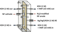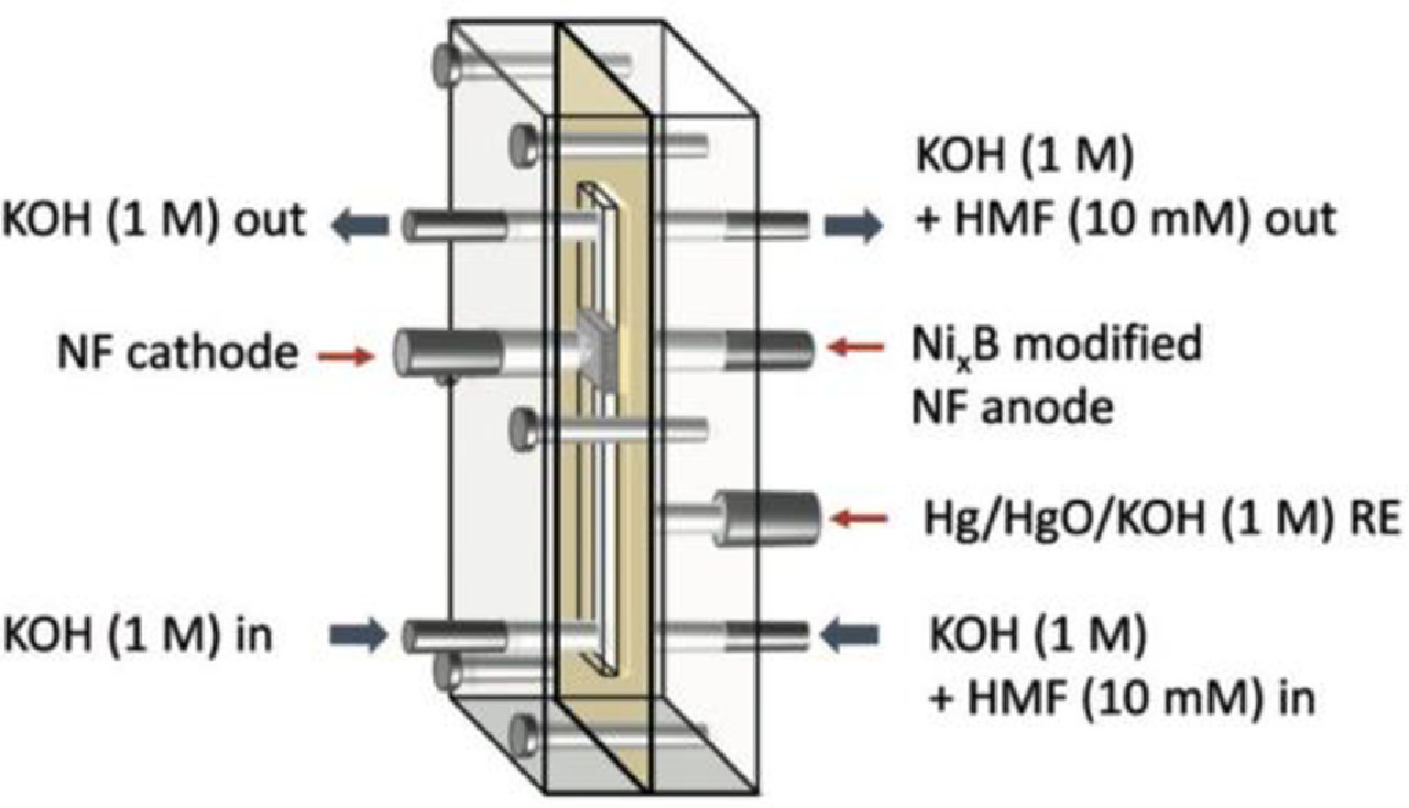 Recently, Barwe et al. achieved a high-surface-area NixB modified NF anode to electrocatalytic oxidation of HMF to FDCA in an electrochemical flow-through reactor (Fig. 7) [34], which could enable the efficient and safe scale-up of electrochemical processes for industrial applications.