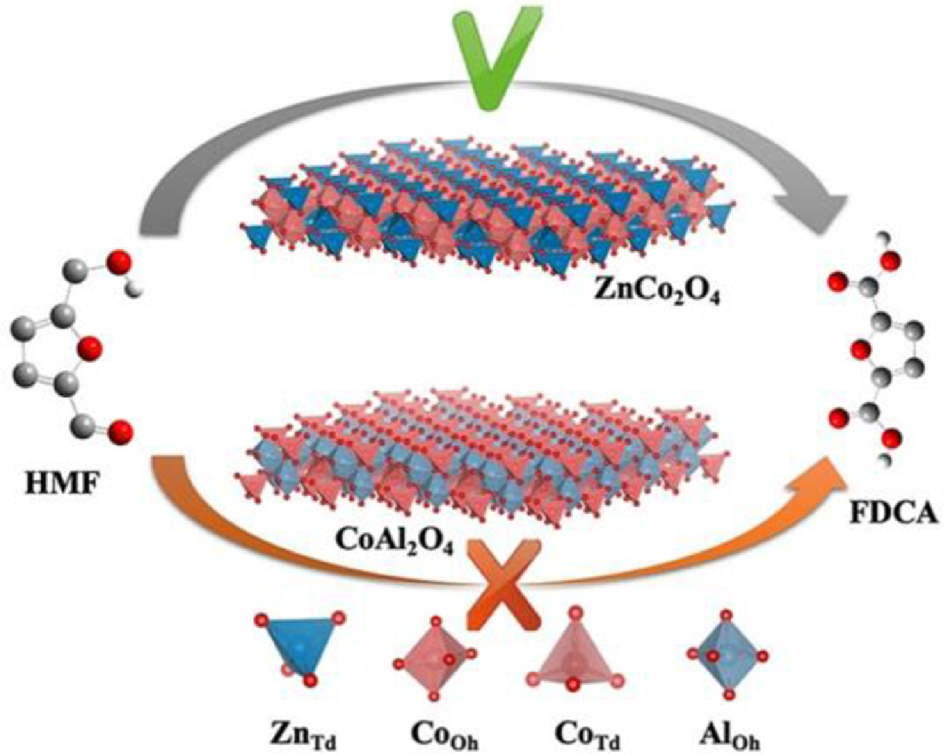 For the Co-based catalysts, Lu et al. investigated Co-based spinel oxides as working electrodes for electrochemical oxidation of HMF to FDCA [61]. By the substitution of the tetrahedral site (CoTd2+) and octahedral site (CoOh3+) in Co3O4 with Zn2+ and Al3+, respectively (Fig. 8), the authors confirmed that CoOh3+ was the optimal geometrical configuration for the oxidation of HMF and CoTd2+ could provide chemical adsorption sites. Based on these, replacing CoTd2+ with Cu2+ to enhance the exposure degree of CoOh3+ and boost acidic adsorption, the obtained CuCo2O4 exhibited a record performance among Co-based catalysts and four times higher than that of Co3O4. Similarly, based on the geometrical configuration of the metal oxides, Lu et al. prepared a 3D hierarchically nanostructured NiO-Co3O4 in-situ grown on the NF electrode for electrocatalytic oxidation of HMF [62]. The crystal structures of Co3O4 and NiO are spinel and face-center cube, respectively, thus the atom permutation cannot be one-to-one correspondence at the interface, providing abundant defects and vacancies. And these vacancies played a decisive role in electrocatalytic HMF oxidation, bringing a high yield of FDCA (98%) and FE (96%).