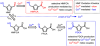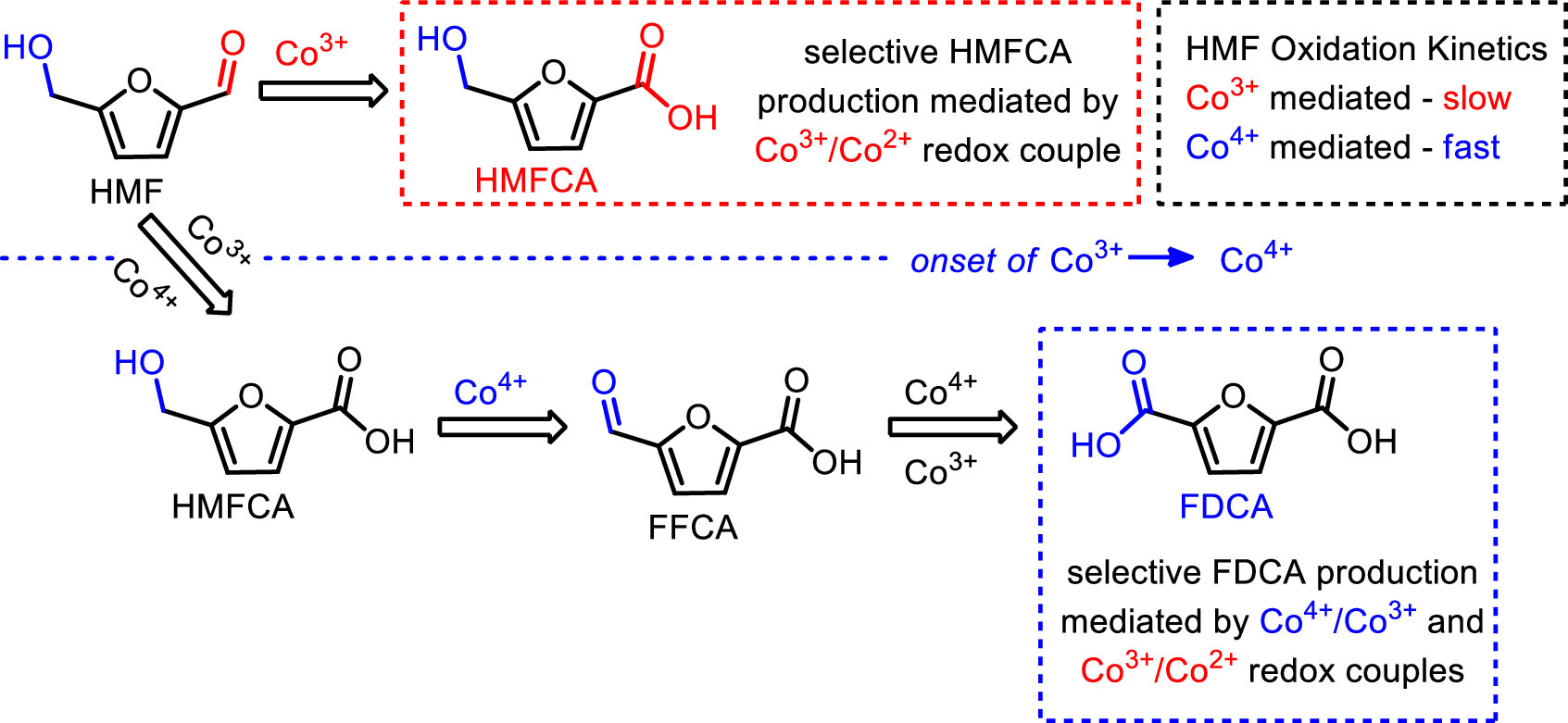 | Fig. 9. Mechanistic illustration of potential-dependent oxidation of HMF to produce HMFCA and FDCA as mediated by electrogenerated Co3+ and Co4+ species | |