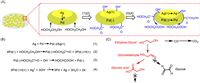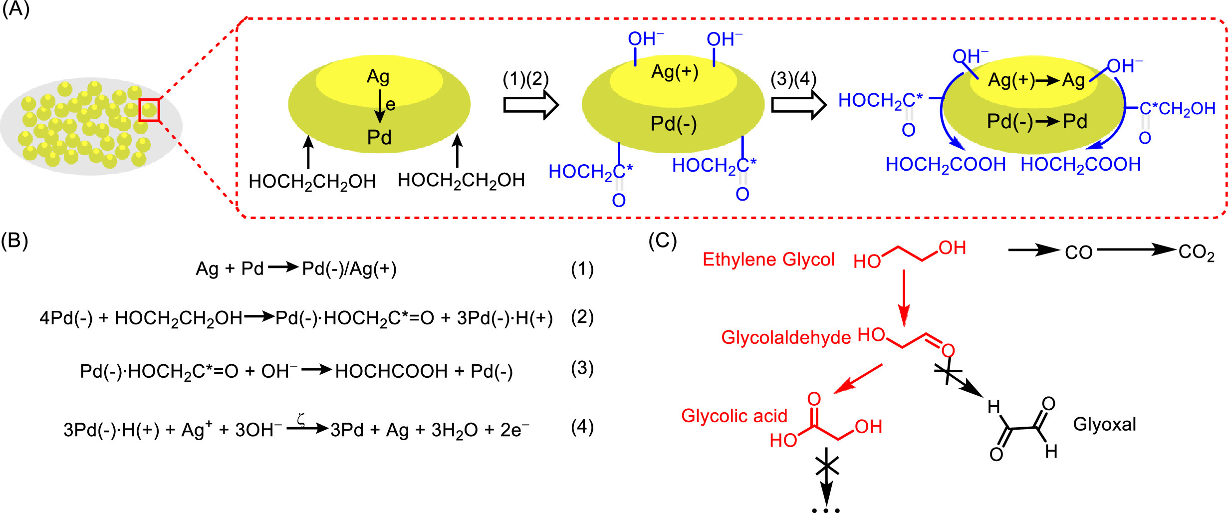 | Scheme 1. Schematic illustration of the proposed synergetic catalytic effect between Pd and Ag. (A, B) A probable mechanism of the synergetic catalytic effect for ethylene glycol oxidation on the PdAg/NF catalyst. (C) General pathway of ethylene glycol oxidation (the red is proposed to be the dominant pathway in this work). | |