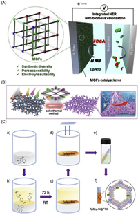 | Fig. 10. (A) 2D MOFs catalyst for electrocatalytic HMF oxidation. Copied with permission [77]. Copyright 2020, Royal Society of Chemistry. (B) Schematic representation for the fabrication of trimetallic MOF arrays on NF and the application of electrocatalytic HMF oxidation. Copied with permission [78]. Copyright 2021, Royal Society of Chemistry. (C) Schematic illustration of the preparation of TpBpy-Ni@FTO. Copied with permission [79]. Copyright 2020, Royal Society of Chemistry. | |