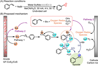 Previous works demonstrated that NaBr was used as a mediator for electrocatalytic epoxidation and obtained good selectivity of olefins [98-100]. However, the used Pt electrode suffers from the corrosion by Br–, while carbon-based electrodes showed particularly low catalytic activity towards NaBr mediator. To address this issue, Zhang et al. proposed using GF-CoS2/CoS heterostructures anchored on graphite felt (GF-CoS2/CoS) to trigger Br–/Br2 redox mediator (Fig. 14) [101]. The experimental results showed GF-CoS2/CoS anode is superior to the Pt electrode in catalyzing Br–/Br2 redox mediator. Under the optimized reaction conditions, the epoxidation of styrene with 97% yield was obtained using GF-CoS2/CoS anode at 30 mA/cm2. Importantly, the applied voltage on the GF-CoS2/CoS-based electrode system was reduced to 4-5 V compared to 7.8–9.3 V on the Pt-based electrode system, saving half of the energy.