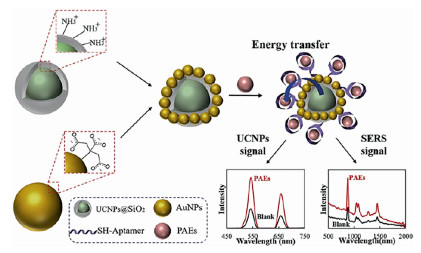 Rong et al. [224] combined fluorescence analysis and SERS technology to prepare a dual-signal detection platform for DBP detection, as shown in Fig. 10. In this system, upconversion nanoparticles (UCNPs) decorated with gold nanoparticles (AuNPs) provide fluorescence signals and serve as Raman enhanced substrates, the aptamer was applied as an identification tag for PAEs. The bimodal nanosensor based on upconversion and SERS technology has been successfully developed for DBP detection in food and its packaging. The method had a good linear relationship, and the detection limits of fluorescence method and SERS method were 0.0087 ng/mL and 0.0108 ng/mL, respectively. Compared with the single-mode optical probe, the hybrid optical probe can exhibit multiple output signals and verify each other to ensure accuracy and prevent non-positive signals. And that bimodal probes have a wider detection range, lower sensitivity, outstanding reproducibility, excellent specificity and selectivity.