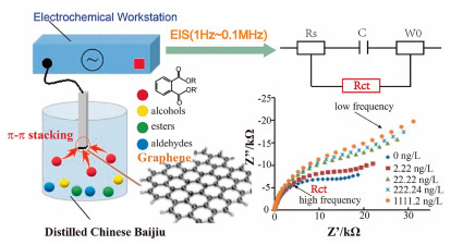 | Fig. 2. A schematic diagram illustrating the basic strategies of in situ preconcentration and detection of PAEs in Chinese liquor with electrochemical impedance spectroscopy. Reproduced with permission [110]. Copyright 2020, the authors. | |