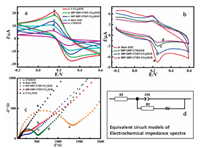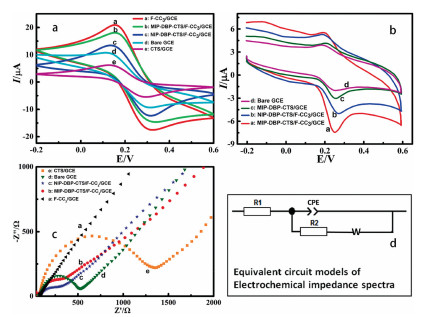 | Fig. 3. (a) Cyclic voltammetric responses of different electrodes at the range of −0.2–0.6 V at 100 mV/s in 5 mmol/L K3[Fe(CN)6]. (b) CVs of different electrodes in 0.01 mol/L PBS (pH 7.0) containing 5 mmol/L K3[Fe(CN)6] after adsorption in 1.8 µmol/L DBP for 120 s. (c) The electrochemical impedance spectrum (EIS) was recorded in 5 mmol/L K3[Fe(CN)6]. (d) Equivalent circuit models of electrochemical impedance spectra (R1: a constant solution resistance, R2: charge transfer resistance (Rct), W: Warburg impedance, CPE: characterization of electrical double-layer capacitor constant phase element). Reproduced with permission [134]. Copyright 2021, Elsevier. | |