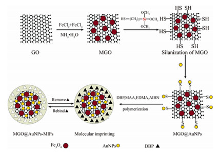 | Fig. 4. Illustrations of fabrication procedure for MGO@AuNPs-MIPs. Reproduced with permission [140]. Copyright 2014, Elsevier. | |