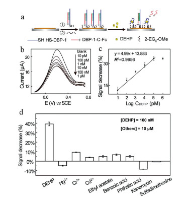 | Fig. 5. PAE SD-EAB for ultrasensitive and ultraselective detection of DEHP: mechanism (a), SWV curves (b), calibration curve (c), and selectivity tests (d). Reproduced with permission [159]. Copyright 2017, American Chemical Society. | |