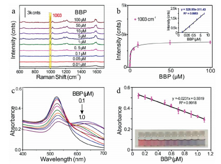 | Fig. 9. (a) SERS spectra of BBP in different concentrations range from 0.01 µmol/L to 100 µmol/L. (b) SERS intensities at 1003 cm−1. Each data point represents the intensity value from five SERS spectra. Error bars show the standard deviations. (c) UV–vis absorption spectra of the AuNPs@β-CD generated in the presence of various concentrations (0.1, 0.2, 0.3, 0.4, 0.5, 0.6, 0.7, 0.8, 0.9, and 1.0 µmol/L) of BBP. (d) The dependence intensity of the AuNPs@β-CD on the increasing concentrations of BBP (inset: corresponding photographs). Reproduced with permission [223]. Copyright 2019, American Chemical Society. | |