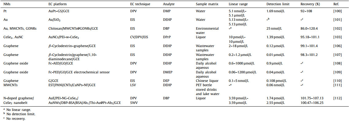In general, the application of nanomaterials presents a tremendous potential for amplification of electrochemical signals. Up to now, the NMs used to detect PAEs comprising metal nanomaterials, nano-metal oxides, other carbon nanomaterials from NMs, are currently used for EC detection of PAEs, as shown in Table 1.