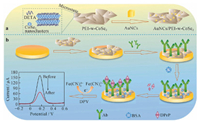 | Fig. 1. Schematic diagrams for (a) constructing AuNCs/PEI-w-CoSe2 and (b) electrochemical immunosensor for DPrP detection. Reproduced with permission [103]. Copyright 2021, Springer. | |