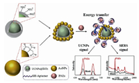 | Fig. 10. Schematic illustration of fluorescence and SERS bimodal nanosensor for PAEs. Inset: the groups on the surface and the TEM images of nanoparticles. Changes in upconversion emission and Raman spectroscopy are also shown in their corresponding spectra and photos. Reproduced with permission [224]. Copyright 2021, Elsevier. | |