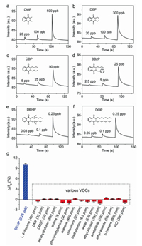 | Fig. 7. (a-f) Time-course curves of fluorescence responses of flower-like 1 microsheets upon exposure to phthalate vapors at different concentrations. (g) Columnar comparison of fluorescence responses of flower-like 1 microsheets upon exposure to DEHP and other different interfering agents at various concentrations. ΔI/I0 represents the change of fluorescence intensity. Error bars represent the standard deviation of five measurements. Reproduced with permission [205]. Copyright 2019, American Chemical Society. | |