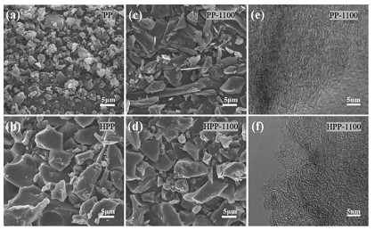 | Fig. 1. SEM images of (a) PP (pristine pitch), (b) HPP (HNO3 pre-oxidation pitch), (c) PP-1100, (d) HPP-1100. HRTEM images of (e) PP-1100, (f) HPP-1100. | |