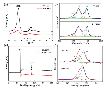 | Fig. 2. (a) XRD patterns, (b) Raman spectra, (c) XPS spectra, and (d) deconvoluted O 1s spectra of PP-1100 and HPP-1100. | |