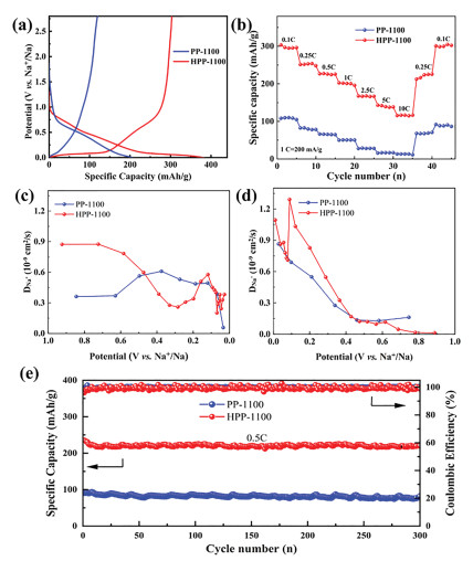 | Fig. 3. (a) Initial discharge/charge curves and (b) rate performance of PP-1100 and HPP-1100. The Na+ apparent diffusion coefficient by GITT during (c) sodiation and (d) desodiation process. (e) Long cycle performance of PP-1100 and HPP-1100. | |