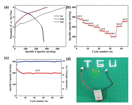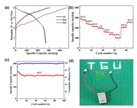 | Fig. 4. Full cell performance: (a) Charge/discharge curve for the first three cycles; (b) Rate performance; (c) Cycle performance; (d) Image of a "TGU" LED bulb lit by full cell. | |