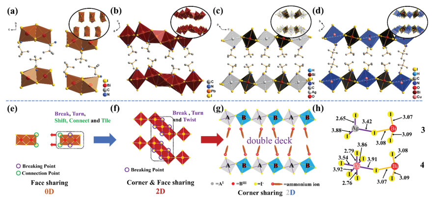 Adopting single crystal X-ray diffraction at different temperatures, the crystal structures of 1, 2, 3 and 4 were determined and their structure refinements are listed in Tables S1 and S2 (Supporting information). Measured and simulated powder X-ray diffraction patterns of 1, 2, 3 and 4 are shown in Fig. S2 (Supporting information). Like most BiI based organic-inorganic hybrid materials, the inorganic octahedrons in 1 adopt the face sharing connection mode to form a zero-dimensional structure (Fig. 1a). Different from 1, the octahedrons consisting of Pb and I in 2 are connected by face sharing and corner sharing mode, and finally a two-dimensional structure is constructed (Fig. 1b). As expected, 3 and 4 were successfully constructed by replacing Pb with Ag & Bi or Cu & Bi, employing a style of two-dimensional corner sharing sandwich structure containing double-deck filling (Figs. 1c and d) and classified as <100> -oriented layered Ruddlesden−Popper double perovskites with n = 1. In order to understand and grasp these four structures and their relationship, the Figs. 1e-g were drawn. The two corner connection points on some shared surfaces in 1 are broken, and then the octahedrons are turned, connected and tiled to finally form a two-dimensional structure of 2. Based on 2, the corner sharing two-dimensional structure of 3 and 4 is finally formed by completely breaking the two corner connection points on the shared surface.
