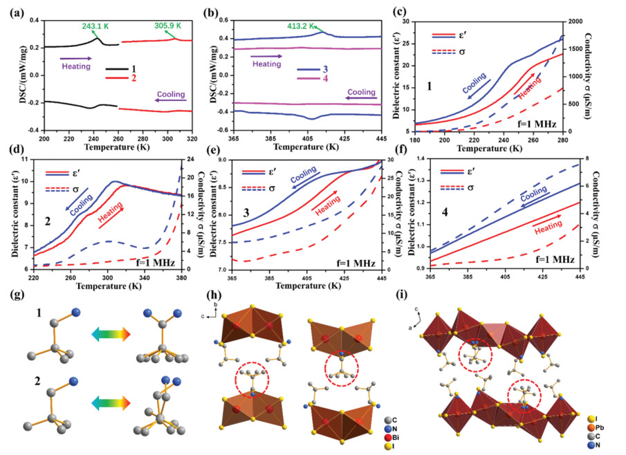| Fig. 2. (a) DSC of 1 and 2. (b) DSC of 3 and 4 in the second lap. (c-f) Dielectric constant ε′ and conductivity σ of 1-4 as a function of temperature. (g) Changes of organic cations in 1 and 2 at low temperature phase and high temperature phase. (h, i) Packing structures of 1 and 2 at high temperature phase. | |
