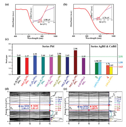 | Fig. 3. The UV–vis absorption spectra of (a) 3 and (b) 4, and corresponding Tauc plots. (c) Optical band gaps of <100> -oriented 2D hybrid perovskites with n = 1 based on PbI, AgBiI and CuBiI. Calculated energy band structure of (d) 3 and (e) 4 without and with spin-orbit coupling (SOC), and corresponding partial density of states (PDOS). | |