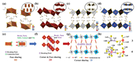 | Fig. 1. Basic structures and inorganic skeleton stacking diagrams (inset) of (a) 1, (b) 2, (c) 3 and (d) 4 at low temperature phase. Diagrammatic drawing of (e) 1, (f) 2, (g) 3 and 4, the transformation relationship of their inorganic skeleton. (h) Bond lengths in inorganic parts of 3 and 4. | |